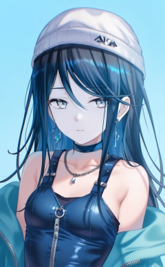 masterpiece,absurdres,best quality,high quality,chromatic_aberration,//,1girl,solo,jewelry,black_hair,long_hair,jacket,hat,necklace,beanie,off_shoulder,earrings,choker,breasts,closed_mouth,upper_body,zipper,collarbone,simple_background,blue_background,bare_shoulders,looking_at_viewer,open_jacket,white_headwear,drop_shadow,expressionless,shadow,blue_choker,small_breasts,open_clothes,aqua_background,piercing,ear_piercing,partially_unzipped,blue_theme,chain_necklace,zipper_pull_tab,blue_jacket,sideways_glance,hair_between_eyes,light_blue_background,sidelocks,chromatic_aberration,blue_eyes,sleeveless,armpit_crease,white_jacket,aqua_jacket,dress,swept_bangs,jacket_partially_removed,tsurime,grey_eyes,straight_hair,//,//,<lora:timmoo——【CKXL】hans:1>,