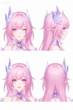 在图像中,她有四个不同的头部角度:前面笑着的头像、侧面头像、面对镜头的头像、以及背面头像。她的衣服是高级的,带有花朵和翅膀形状装饰,色彩与她的头发和眼睛相配。她的肩膀和颈部都有花朵形状装饰,给人一种美丽和精致的感觉。