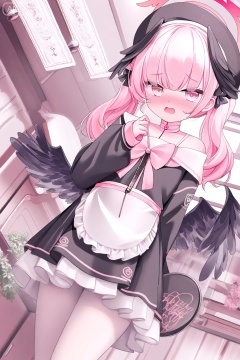 chen_bin,koharu \(blue archive\), black bow, black wings, bow, hair bow, halo, holding, holding plate, maid, open mouth, pantyhose, pink bow, pink eyes, pink hair, pink halo, plate, twintails, white background, white pantyhose, wings