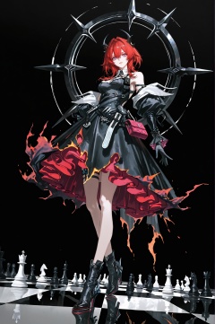 masterpiece,best quality,good quality,high resolution,8K UHD,photorealistic,(artist:quasarcake:0.8),extreme aesthetic,(wlop:0.6),(honjou raita,lack,rella,wanke:0.5),<lora:ponyv6_noobV1_2_adamW-000017:0.25>,<lora:anato_finnstark_illust_v10-000015:0.3>,<lora:ck-shadow-circuit-IL-000012:0.3>,in the style of cksc,<lora:flatline_v2_-_Illus_x_Niji:0.3>,Flatline,Flat vector illustration,<lora:jiaocha_illustriousXL:0.3>,dynamic dutch angle,from below,simple_black_background,black and white theme,Sense of coordination,sense of order,mathematics beauty,(((cover design))),(((((cover art))))),((trim)),album_art,official art,(Master's work),chessboard,chess,white geometry,black geometry,reflection,crystal_art,pattern_design,creative,Mystery pattern,black crystal decorate,black crystal,(architectural art),((geometric art)),pattern design,creative,------,Low saturation,grand masterpiece,Perfect composition,film light,light art,<lora:Laevatain-will-Tanger-000013:0.7>,Laevatain \(Arknights: Endfield\),devil girl,Laevatain's horns,clothes: Laevatain def black dress,1girl,gloves,purple eyes,red hair,