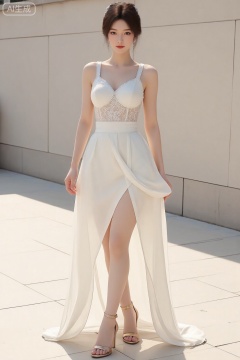 Wide-angle lens,35mm equivalent focal length,shallow depth of field,front viewing angle,shooting from a slightly right angle of the front,three-point composition,the main body is located at the 1/3 on the right side of the picture,composition content description: people occupy the main part of the picture,the skirt extends to the foreground,forming a visual guide line,the background is left blank to highlight the main body,