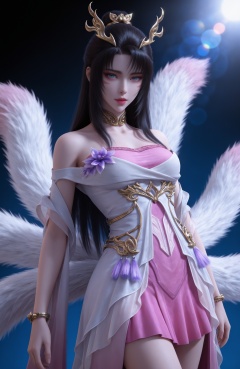 <lora:完美世界-魔女天狐IL:0.7> 1girl, long hair, black hair, hair ornament, hair bun, bare shoulders, jewelry, pink dress, bracelet, tail, blue eyes, facial mark, sandals, realistic style photo,outstanding style,Use soft lighting to cast gentle shadows on the subject,adding a touch of dimension to your images without compromising details,whirls of vapor,(Anime:1.1),soft neon light,ethereal ambiance,delicate details,magical atmosphere,concept art,highly detailed,ultra-high resolution,32K UHD,sharp focus,best-quality,masterpiece,golden hour,unconventional supreme masterpiece,masterful details,temperate atmosphere,with a high-end texture,in the style of fashion photography,magazine style,Dynamic Angle,Dynamic posture,magazine style,Dynamic Angle,Dynamic posture,(cowboy_shot:1.2),eye trail,depth of field,cinematic lighting,lens flare,close-up,extreme aesthetic,(wlop:0.6),(honjou raita,lack,rella,wanke:0.5),masterpiece,best quality,good quality,newest,year 2025,very aesthetic,absurdres,Visual impact,A shot with tension,ultra-high resolution,32K UHD,sharp focus,best-quality,masterpiece,Emotionalization,unconventional supreme masterpiece,masterful details,temperate atmosphere,with a high-end texture,in the style of fashion photography,(Visual impact:1.2),giving the poster a dynamic and visually striking appearance,, realistic style,white background,upper body,looking at viewer,dynamic posture,, solo,upper body,looking at viewer,gradient background,gradient,blue background,black background,