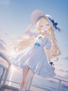 masterpiece,very aware,highres,absurdres,newest,best quality,petite,high quality,chromatic_aberration,cinematic_angle,dutch angle,child,petite,//,1girl, solo, dress, hat, white dress, long hair, sky, outdoors, cloud, white headwear, very long hair, day, blue eyes, ribbon, white socks, sun hat, socks, necklace, blue sky, blue ribbon, watercraft, boat, dutch angle, braid, wrist ribbon, jewelry, hand on headwear, frills, railing, looking at viewer, frilled dress, short sleeves, breasts, kneehighs