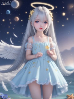 loli,1girl,angel,angel_wings,blue_eyes,blue_flower,constellation,crescent,cross,dress,feathered_wings,flower,hair_between_eyes,hair_ornament,halo,long_hair,looking_at_viewer,planet,solo,star_\(sky\),star_\(symbol\),star_hair_ornament,star_print,starfish,starry_background,starry_sky,very_long_hair,white_feathers,white_hair,white_wings,wings,