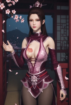 (cowboy shot:1.2),(looking at viewer:1.1),masterpiece,(best quality),smog,Dark room,dim lighting,peach blossom,falling petals,<lora:YQ_Illustrious光辉v5_玄净天_V1:0.8>,q1528437228,1girl,solo,long hair,black hair,makeup,breasts,hair ornament,tattoo,brown hair,black eyes,detached sleeves,dress,chinese clothes,brown eyes,gloves,scarf,boots,pantyhose,elbow gloves,sleeveless,hair bun,
