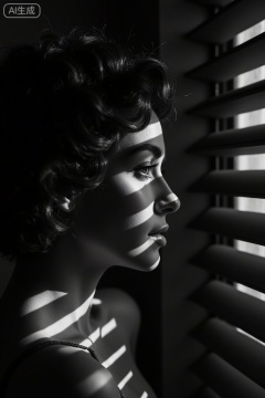 filmmood, a classic film noir inspired shot. A profile view of a woman peering through window blinds. The sunlight casts sharp, rhythmic shadow stripes across her face and curly hair. The mood is suspenseful, voyeuristic, and intimate, relying heavily on the pattern of light and shadow (chiaroscuro).
