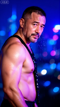 一个中年男人,有一张硬朗、阳刚的脸和整洁的短发。他赤膊上阵,肌肉被脂肪覆盖,但身体紧绷,肌肉线条有力,置身于迷幻的蓝色与紫色霓虹灯光中,他正回眸凝视镜头,眼神充满故事感,他身着带有亮片的黑色吊带背心,脸上的汗滴被风吹起,背景是虚化的都市夜景与闪烁的灯光,摄影,照片级真实,人像模式,焦距85mm,光圈f/1.4,ISO 400,背景光斑如奶油般化开,极致细节,4K壁纸,电影感光影,