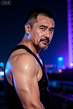 一个中年男人,有一张硬朗、阳刚的脸和整洁的短发。他赤膊上阵,肌肉被脂肪覆盖,但身体紧绷,肌肉线条有力,置身于迷幻的蓝色与紫色霓虹灯光中,他正回眸凝视镜头,眼神充满故事感,他身着带有亮片的黑色吊带背心,脸上的汗滴被风吹起,背景是虚化的都市夜景与闪烁的灯光,摄影,照片级真实,人像模式,焦距85mm,光圈f/1.4,ISO 400,背景光斑如奶油般化开,极致细节,4K壁纸,电影感光影,