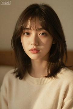 casting gentle shadows that accentuate her features and create a soft glow on her skin. She wears a cream-colored knitted sweater with a visible ribbed texture around the neckline. Her eyes are large and brown