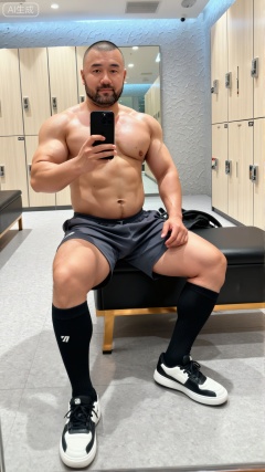 一位留着寸头、带有胡须的脂包肌身材的男性,赤裸上身,肌肉线条清晰(胸肌、腹肌、手臂肱二头肌饱满紧实),穿着深灰色运动短裤,搭配黑色长筒袜与白黑配色的休闲运动鞋。他坐在健身房更衣室的浅木色储物柜前的长椅上,右手举着黑色手机遮挡面部自拍,左手自然搭在腿上。背景是浅灰色地面、带纹理的墙面与嵌入式镜子,室内灯光明亮柔和,整体画面为4K高清画质,细节锐利,色调干净简洁,呈现出运动后放松的状态。