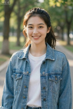 natural sunlight. She wears a light blue denim jacket over a plain white t-shirt