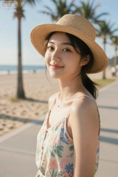 wearing a light brown woven straw hat and a floral-patterned sleeveless top in soft pastel tones of pink