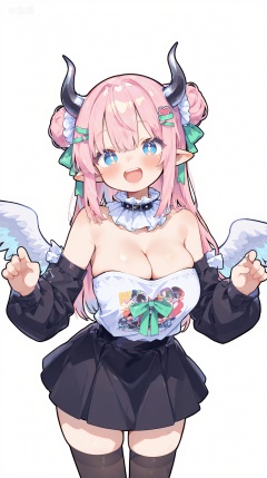 bf,1girl, :d, bare shoulders, black skirt, black sleeves, black thighhighs, blue eyes, blush, breasts, choker, cowboy shot, detached sleeves, double bun, feathered wings, frilled choker, frills, green ribbon, hair bun, hair intakes, hair ribbon, heart, heart print, horns, large breasts, long hair, long sleeves, looking at viewer, miniskirt, open mouth, pink hair, pleated skirt, pointy ears, print shirt, ribbon, shirt, single horn, skirt, smile, solo, strapless, strapless shirt, thighhighs, twitter username, white shirt, white wings, wings