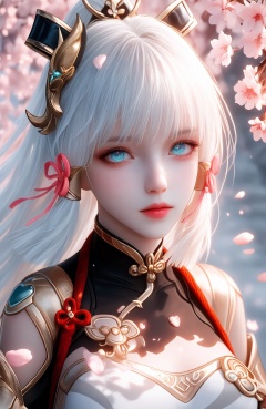 This is a digital artwork depicting a young woman with a strikingly realistic, almost ethereal appearance. She has pale, almost porcelain skin and large, luminescent blue eyes that are slightly narrowed, giving her an intense, focused expression. Her long, straight white hair is adorned with two gold and black ornamental pieces on either side of her head, and pink ribbons are tied in small bows on either side of her head. She wears a dark blue, high-collared garment with gold trim and intricate patterns, which appears to be a part of a traditional or fantasy-style outfit. A black choker with a gold and black pendant hangs around her neck. The background is a dark, out-of-focus blue, with soft pink cherry blossom petals scattered throughout, adding a delicate, almost dreamlike quality to the image. The lighting is soft and diffused, highlighting the smooth texture of her skin and the fine details of her hair and eyes. The overall style of the artwork is highly realistic with a fantasy element, focusing on detailed textures and subtle, yet effective, use of color and light to create a captivating and immersive portrait.