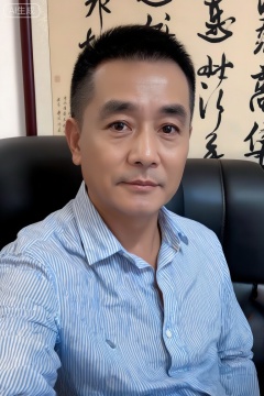40岁左右的中年男性黄伟,气质沉稳内敛,留着短黑发,身着蓝白条纹衬衫,坐在黑色皮质座椅上,背景有带有书法字体的卷轴,整体环境透着文雅气息,光线明亮自然。