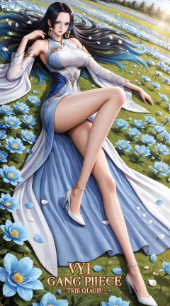 clothes: tangwutong white-and-blue dress, 1girl, solo, long hair, blue hair, breasts, flower, lying, flower field, on back, legs, detached sleeves, high heels, bare shoulders, petals, jewelry, bare legs, field, full body, thighs, white footwear, blue flower, large breasts