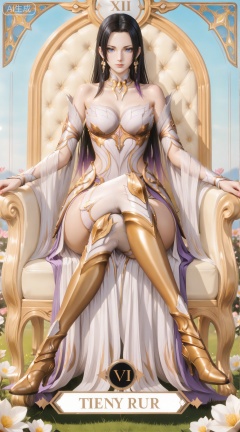 clothes: qianrenxue white and purple dress,qianrenxue armor,qianrenxue armored boots,qianrenxue armored dress,qianrenxue detached sleeves,qianrenxue high heel boots,qianrenxue white thighhighs,qianrenxue greaves,1girl,sitting,solo,breasts,long hair,crossed legs,bare shoulders,throne,thighs,medium breasts,cleavage,