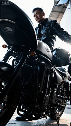 中国男性, 面容冷峻,穿着皮质机车服,跨坐在重型机车上的男士。风格为酷炫机车风,光线用强烈的逆光,勾勒出硬朗的轮廓,渲染出冷峻不羁的气场。色彩以黑、银为主,凸显金属质感。构图采用对角线构图,将人物与机车沿对角线分布,增强画面张力。从侧前方低角度仰拍,突出机车与人的高大。相机参数设为大光圈,高速快门定格瞬间,生成高分辨率、质感爆棚的图片,尽显男性的阳刚与霸气。