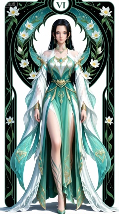 clothes: doushengxiaoxuner green and white dress, doushengxiaoxuner leg tattoo, 1girl, long hair, solo, full body, jewelry, white background, earrings, black hair, green dress, hair ornament, closed mouth, standing, simple background, bracele