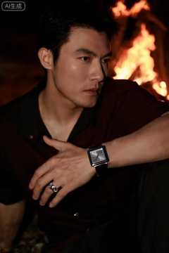 构图上,采用了近景特写,将镜头聚焦在人物的上半身以及手部,突出人物的细节和配饰,同时背景的火焰作为环境元素,丰富了画面内容,也烘托了整体氛围,镜头视角为平视,给人一种自然,亲近的感觉,仿佛观者与人物处于同一空间,能真切感受到他身上散发的独特魅力,传递出一种成熟,优雅且充满故事性的情绪,