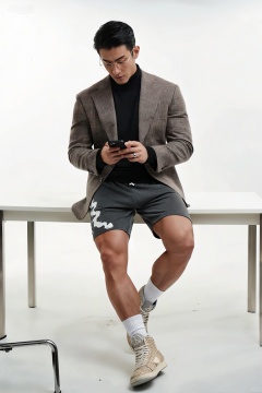 穿着:上身穿着棕灰格纹羊毛西装外套,剪裁合体,肩线挺括,内搭黑色高领针织衫,袖口露出一截黑色衬衫袖边;下身搭配深灰色运动短裤,裤侧有白色抽象图案装饰,材质为轻质混纺面料;脚穿米白与浅灰拼色高帮运动鞋,鞋面带有编织纹理细节,配白色中筒袜,整体造型融合正式与休闲风格。