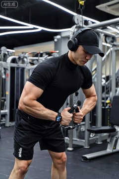 主体描述:一位年轻男性,约二十五至三十岁,身材精壮,肩宽背厚,肌肉线条分明但不夸张,面部轮廓清晰,短发整齐,佩戴黑色棒球帽与头戴式耳机,神情专注,目光低垂注视器械,嘴角微抿,展现出高度集中的训练状态。