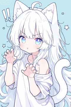 loli, 1girl, solo, long hair, looking at viewer, blush, bangs, blue eyes, simple background, shirt, animal ears, very long hair, closed mouth, tail, white shirt, ahoge, white hair, short sleeves, cat ears, off shoulder, star \(symbol\), v-shaped eyebrows, cat tail, animal ear fluff, hands up, blue background, cat girl, !, :t, pout, claw pose, !!, oversized shirt
