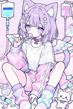 1girl, animal collar, animal ear fluff, animal ears, candy, cat ears, cat girl, cat tail, collar, food, hair ornament, holding, holding candy, holding food, holding lollipop, intravenous drip, jacket, lollipop, loose socks, monster energy, pill, pink shorts, purple eyes, purple hair, shirt, shorts, socks, solo, star \(symbol\), star hair ornament, stuffed animal, stuffed toy, syringe, t-shirt, tail, virtual youtuber, white shirt, wings, yume kawaii