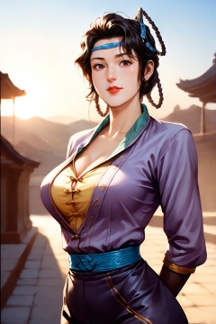 safe_pos,score_9,score_8_up,score_7_up,yuanshen,1girl,solo,black hair,brown eyes,braid,lips,hair rings,lipstick,headband,pants,large breasts,cleavage,arms behind back,looking at viewer,cowboy shot,nice hands,<lora:pony神兵玄奇-北冥雪:1>,(highres, high quality:1.3),intricate details,sharp focus,depth of field,outdoors,sunlight,soft focus,bright skin,Holy lighting,white skin,mature female,magnificent architecture,beautiful detailed sky,overexposure,dynamic pose,dynamic angle,<lora:add-detail-xl:0.5>,mature female,curvy,shiny skin,oiled skin,Expressiveh,