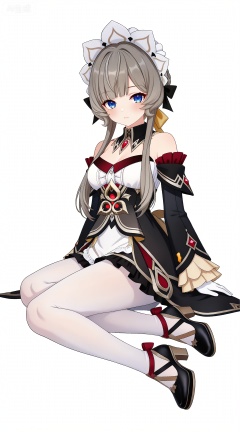depth of field,masterpiece,best quality,very aesthetic,alternate costume,alternate costume,2024,2023,perfect composition,ultra-detailed,extreme aesthetic,masterpiece,best quality,good quality,newest,year 2024,year 2023,very aesthetic,absurdres,looking_at_viewer,colorful,,brown hair,grey hair,blue eyes,blunt bangs,braid,braided bun,detached collar,hair bow,headdress,maid headdress,hair bun,french braid,short hair with long locks,muou black and white dress,muou detached sleeves,muou frilled sleeves,muou white pantyhose,muou high heels,muou white gloves,1girl,solo,full body,looking at viewer,breasts,closed mouth,simple background,white background,bare shoulders,cleavage,arms at sides,medium breasts,sitting,yokozuwari,(from_side:1.2),