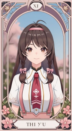 brown hair, brown eyes, long hair, twin braids, side braids, ahoge, ganxue black bow, ganxue white shirt, ganxue suspender skirt, ganxue high-waist skirt, ganxue hair bow, ganxue pink skirt, ganxue pink necktie, ganxue pink ribbon, 1girl, solo, smile, upper body, closed mouth, looking at viewer, parody, virtual youtuber