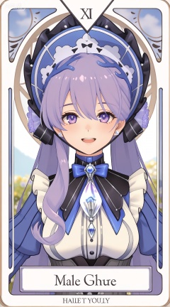 purple hair, long hair, twintails, purple eyes, mali bonnet, hair between eyes, blue headwear, mali gem brooch, mali hair flower, mali blue and white dress, mali juliet sleeves, mali bowtie, mali striped clothes, mali frills dress, mali apron, mali corset, 1girl, solo, looking at viewer, jewelry, breasts, open mouth, smile, earrings, bow, white background, upper body