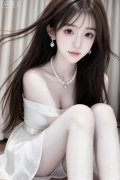 Real photography, Asian beautiful girl with long straight brown hair, wearing a pearl necklace and gorgeous earrings, wearing a white waist dress (with a white wide belt), with curtains in the background, the overall style is elegant and refined, full of retro and fashionable high-end atmosphere. Oblique composition, beautiful face, frontal shot, ultra-clear picture quality, exquisite makeup, exquisite accessories, cute makeup, gentle and generous, exquisite facial features, clear face, (movie-level surface light: 1.6), (ray tracing: 1.5), (smooth skin with cold white and comic texture: 1.7), (character has the best bones: 1.2), (internet face: 1.6) , perfect body, Morandi color matching, good-looking internet celebrity, INS style, childish face, 19-year-old girl with pointed chin, balanced proportions of three courts and five eyes, petite body, delicate porcelain supple skin, cold white skin, random makeup, random accessories, random movements, side light, light and messy hair, shot at random angles, overall there is a lot of uncertainty, but she looks good.
