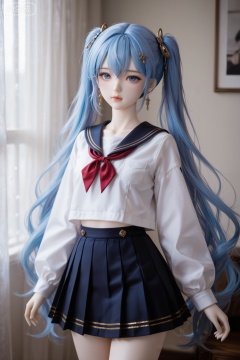 这是一副BJD风格图,该图像描绘了一个高度细致的动漫风格角色,长长的、飘逸的蓝色头发扎成两个马尾辫,每个马尾辫都装饰着金色的配饰。该角色穿着校服,包括一件带有泡泡袖和红色蝴蝶结的白色衬衫,以及一条带有金色装饰的海军蓝百褶裙。背景灯光柔和,有一扇带有透明窗帘的大窗户,墙上挂着一幅镶框的照片。整体气氛平静,重点关注角色复杂的设计和服装。