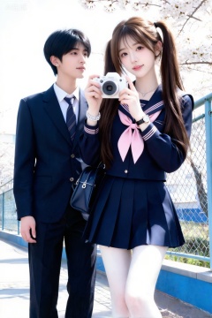 真实摄影,棕色长发(双马尾),身着深蓝色制服(带粉色领结装饰)、同色百褶短裙,手持白色相机,站在樱花树下的铁丝网旁;背景为春日樱花场景(盛开的白色樱花树、铁丝网、远处的建筑、明亮的自然光线,清新质感);清新校园场景,蓝粉彩色系与制服、樱花元素交织,衬出活力氛围;清新质感,光线充足(户外强光),中景构图,视觉焦点集中;光线突出水手服的校园感与樱花的烂漫,视觉效果活力;深蓝色水手服与粉色领结作亮点,与樱花背景呼应,清新校园氛围感拉满,倾斜构图,最高等级画质,IHD,美颜全开,超高清,32k分辨率,去掉一切噪点,冷色调,高曝光,高亮度采用微距镜头半身拍摄,聚焦于她上半身,将每一处细节都清晰展现,超细节呈现出她冷白、匀净、清透且细腻的皮肤。侧光出片氛围拉满;神情松弛自然,奶油白肌肤,微醺,柔和色彩,磨皮人物轮廓边缘,清新,质感最高级,层次丰富,神态肢体自然,妆容清透,背景虚化突出主体,风格温柔有视觉张力。互动道具:钻石手环。 照片感染力,故事感,强烈阳光照在腿上,身材完美,背着小包包,戴耳钉,戴手表,戴项链,(电影级面光:1.6),(光线追踪:1.5),(冷白皮漫感质感的光滑皮肤:1.7),(人物有最好的骨相:1.2),(网感脸:1.6),身材完美,莫兰迪配色,高颜值网红,INS风,幼态脸,20岁女生尖下巴,三庭五眼比例均衡,身材娇小,细腻陶瓷水嫩肌肤,偏冷白皮,随机的妆容,随机的饰品,随机的动作,侧光,随机角度拍摄,总体有很多的不确定性,但又好看, 甜美少女,氛围慵懒俏皮,东方美女,黑长直,年轻娇小,发丝呈现出自然的蓬松感与垂坠感,长发散落于肩头两侧,冷白皮气质美女,薇薇纯欲风,皮肤白皙,偶像气质,fairskin,气质的江南美女子,有点甜美,皮肤美白透亮,表情可爱,甜美氛围,细腻笔触,独特韵味的美,,单反相机效果,50mm焦距,情侣风格照片,高质量,必须男生和女生互动。