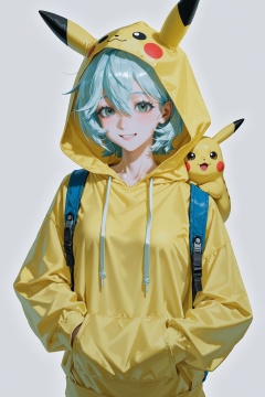 yoneyama mai,diyokama,amano yoshitaka,quasarcake,1girl,seed \(zenless zone zero\),light_blue_hair,A girl wearing a Pikachu hoodie and a blue backpack,white background,(looking at user:1.2),flat color,no lineart,SimplePositiveXLv3,happy,close up,