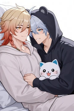 (wearing matching animal kigurumi pajamas:1.4), (one wearing white cat hoodie, one wearing black bear hoodie:1.2), hood up, animal hood, long sleeves,
