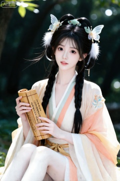 随机运镜,随机姿势表情,年轻的贵族古风少女,精致妆容,特写,全身,皮肤白皙光滑,两绺细发辫垂落肩头显端庄温婉,点缀柔软稀薄的丝缕毛翎饰(随风自然垂坠贴着发鬓),玉钗绢花发饰,发间点缀丝绢小蝶饰(薄感透明形态柔软生动自然)与乌发对比鲜明交相辉映;身着大袖古风襦裙,外层宽松交领半袖(领口素雅撞色),内搭,下配裙腰间系素色丝带,双手捧着古旧竹简卷轴,手指轻扣竹简侧面,眼神清澈微侧头望向镜头,黑瞳灵动,脸颊清瘦,温婉,天真,绝美略带清冷,面部线条柔和,皮肤白皙细腻;户外古风林间,重度虚化的深绿色树木枝叶间,光斑透过叶隙形成自然散景,自然柔光笼罩全身,营造清幽氛围;古风真人摄影风格,电影感写实画质,画面质感细腻通透,带轻微自然胶片颗粒感,色彩还原真实自然;色调以蜜合色、桃夭色,栀黄色,白色为主,整体清新明快,冷暖对比和谐;随机构图,随机角度运镜,随机姿态表情,聚焦少女五官清晰刻画与持卷轴动作,背景虚化突出主体;超高清画质,细节丰富清晰,细腻刻画丝绸纹理、广袖柔软细腻的垂坠感层次,衣身苏绣暗纹精致繁复,竹简木竹纹理,发丝光与饰品材质质感,背景树叶光影斑驳与散景效果,人物面部自然妆容与神态细节,确保人物造型与发型完整无缺,故事情节,既视感,现场感,快照门,抓拍,胶片摄影,复古色调,20岁江南绝美少女,冷白皮瓷感透亮肌,幼态脸五官精致,纯欲甜妹气质,慵懒俏皮氛围,S曲线挺拔身材,上围,娇小东方美,三庭五眼均衡,可爱表情,中国传统配色,INS质感,weiting效果,超高清细节拉满,侧光随机角度动作,高颜值偶像感,细节完美