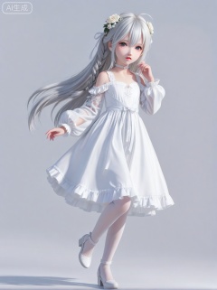 loli,petite,1girl, solo, long hair, high heels, white theme, flower, hair flower, white rose, white flower, full body, hair ornament, dress, white hair, white dress, pantyhose, looking at viewer, white background, rose, simple background, grey eyes, white pantyhose, braid, white footwear, parted lips, very long hair, shoulder cutout, long sleeves, frills, ribbon, skirt, hair ribbon, white ribbon, single braid, white skirt, standing, hair between eyes, hand up, hand in own hair, shirt, clothing cutout, puffy sleeves, white eyes, frilled dress, floating hair, ahoge, standing on one leg, choker, open mouth, detached sleeves, puffy long sleeves, bare shoulders, white shirt, white choker