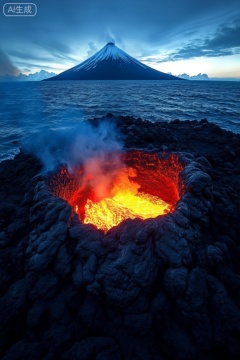 National Geographic,a volcano is burning in the middle of the ocean. The lava is glowing orange,creating a stark contrast against the dark gray rocks. The volcano's smoke,adding a touch of smoke to the scene. The sky,a deep blue,is adorned with a few wispy clouds,adding depth to the composition. The mountain in the distance,its snow-capped peaks peaks against the horizon.,
