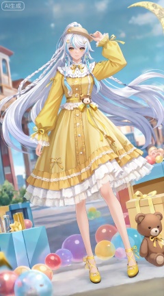 1girl, solo, dress, full body, braid, brown eyes, stuffed toy, standing, looking at viewer, long sleeves, stuffed animal, constellation, teddy bear, long hair, hat, yellow dress, frills, single braid, yellow footwear, frilled dress, 7