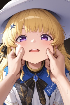 1boy, 1girl, phoebe \(wuthering waves\), black ribbon, blonde hair, cheek pinching, cross hair ornament, hair ornament, hair ribbon, hat, long hair, looking at viewer, open mouth, pinching, ribbon, shirt, solo focus, sweat, teeth, upper body, upper teeth only, white hat, white shirt, purple eyes, hat