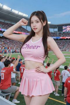 <lora:20260204_TinZ-ImageTurboGirlLora:0.8>, Create an image of a young woman posing confidently in a vibrant sports stadium. She has long, dark hair styled in a sleek ponytail, and her makeup is fresh and youthful, featuring a soft pink lip color and subtle eye makeup. She is wearing a fitted cheerleader outfit that consists of a sparkling pink crop top with the word "Cheer" embellished in glittering letters and a matching pleated mini skirt.The background showcases a lively sports scene filled with cheering fans dressed in team colors, with a clear blue sky overhead and stadium lights glowing in the background. The atmosphere is energetic and festive, capturing the spirit of a game day. The focus is on the cheerleader, who is striking a playful pose with her fist raised confidently. The overall color palette consists of pinks, whites, and pops of color from the crowd, enhancing the dynamic and cheerful mood of the scene.