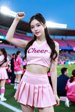 Create an image of a young woman posing confidently in a vibrant sports stadium. She has long, dark hair styled in a sleek ponytail, and her makeup is fresh and youthful, featuring a soft pink lip color and subtle eye makeup. She is wearing a fitted cheerleader outfit that consists of a sparkling pink crop top with the word "Cheer" embellished in glittering letters and a matching pleated mini skirt.The background showcases a lively sports scene filled with cheering fans dressed in team colors, with a clear blue sky overhead and stadium lights glowing in the background. The atmosphere is energetic and festive, capturing the spirit of a game day. The focus is on the cheerleader, who is striking a playful pose with her fist raised confidently. The overall color palette consists of pinks, whites, and pops of color from the crowd, enhancing the dynamic and cheerful mood of the scene.