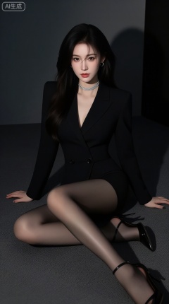 A captivating East Asian woman with long, flowing dark hair styled in a soft, windswept manner, sitting elegantly on a plush carpeted floor in a dimly lit, minimalist space. She wears a tailored black blazer dress with a deep V-neckline and structured shoulders, exuding confidence and sophistication. The outfit is paired with sheer black tights and sleek black heels with delicate straps, accentuating her graceful legs. Her accessories include a sparkling silver choker, small hoop earrings, and subtle nail art—adding a touch of glamour to the monochrome look. One hand rests gently on the floor while the other lies relaxed beside her, creating a poised yet natural pose. The lighting is dramatic and low-key, casting soft shadows and highlighting her facial features and silhouette against the dark background. The mood is intimate, mysterious, and fashion-forward, evoking high-end editorial photography. — ar 3:4 --v 6 --style raw --lighting cinematic chiaroscuro, moody atmosphere, elegant darkness, modern glamour
