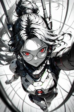 mecha_girl,1girl, ((solo)),single hair bun,very long hair,upper body,close up,depth_of_field,lips,red eyes,body suit,Facial close-up, large perspective, foreground focus, background composed of data cables, (((from above))),Exquisite glasses,mole under eyes,//