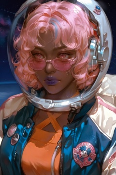 1girl, afro, badge, blue background, blue hair, blue jacket, blue lips, closed mouth, criss cross halter, curly hair, dark skin, fishbowl helmet, glasses, halterneck, headphones, helmet, jacket, letterman jacket, multicolored hair, night, night sky, open clothes, open jacket, orange eyes, orange hair, orange shirt, pin, pink tinted eyewear, pink eyes, pink hair, ringed eyes, shirt, short hair, sky, solo, space, space helmet, star sky, star on cheek, starry sky, streaked hair, striped clothes, striped jacket, tinted eyewear, upper body, very dark skin