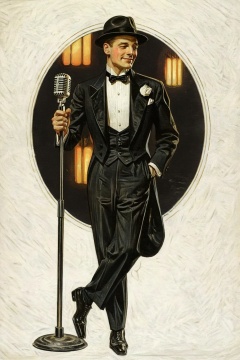 Full-length shot of a slender Caucasian man with a confident, slight smile. He is impeccably dressed in a mid-century style black tuxedo with a shawl lapel, a crisp white pleated shirt, a black bow tie, and a white pocket square. A black felt fedora sits atop his head, and he wears polished black dress shoes. He poses with a relaxed elegance, one hand in his trouser pocket and the other holding a tall, vintage silver microphone stand. His legs are casually crossed at the ankle. The background is a dark, atmospheric space filled with glowing, vertical rectangular panels in shades of amber and gold. Soft, directional lighting highlights the textures of his suit and creates a sophisticated, nostalgic mood, evoking the classic era of jazz vocalists.
