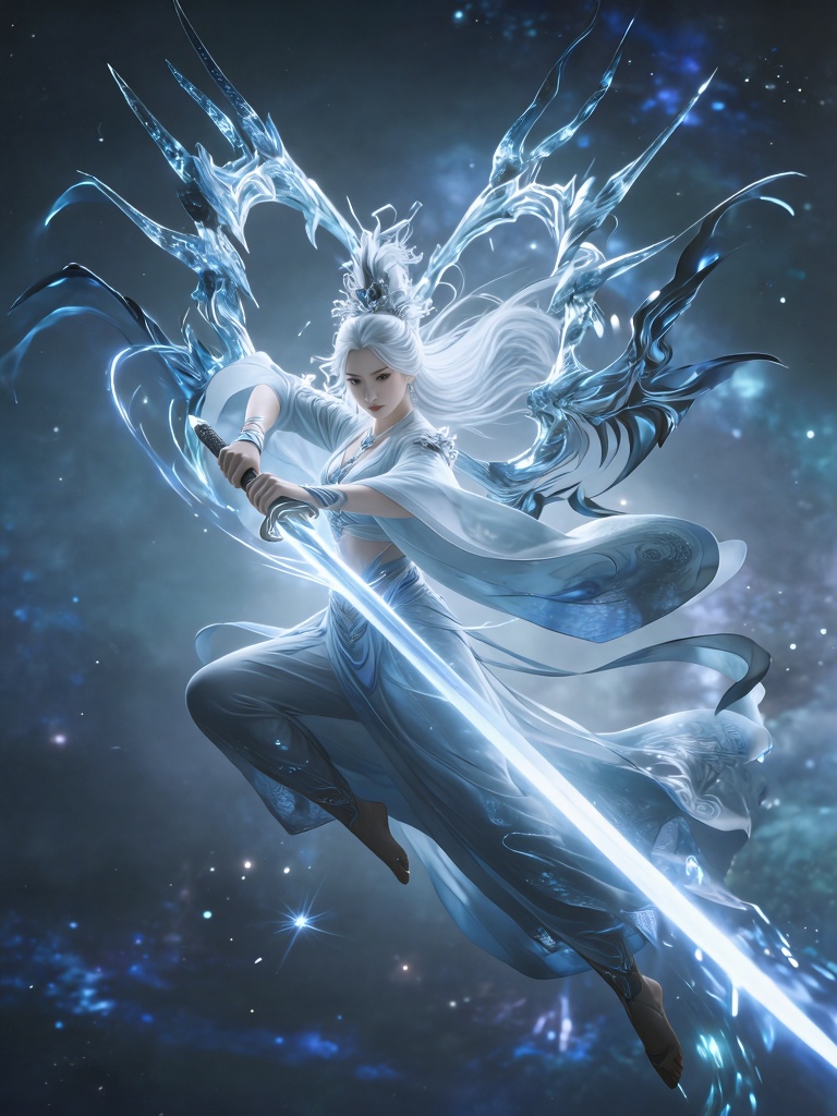 凌雪角色银发女子凌空持剑,身着飘逸蓝白长袍,背后展开冰晶状羽翼。中景镜头聚焦其专注神情与挥 - 2026-02-27 20:00:35