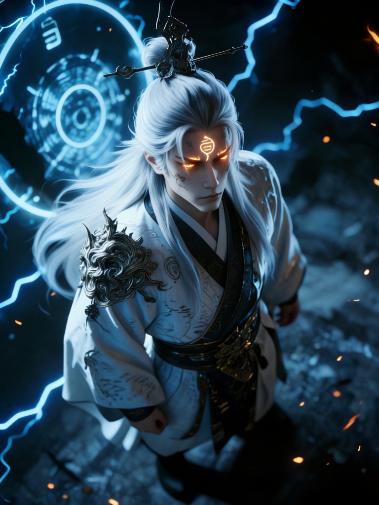 道玄角色,高角度中景镜头下,一位白发古风男子立于幽暗空间,身着绣纹白衣与黑金腰带,左肩饰繁 - 2026-02-28 23:54:13